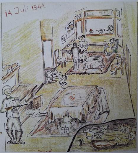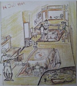 Daar zijn de drie oudste jongens geboren. In de oorlog hielden mijn ouders twee jongemannen verborgen die zich onttrokken aan de Arbeitseinsatz. In een kast was de bodem losgemaakt waardoor de jongens de kruipruimte konden invluchten. Hoewel ze werden verraden, hebben ze zich daarin op tijd kunnen verbergen. Een van de twee heeft tekeningen gemaakt van hun situatie.